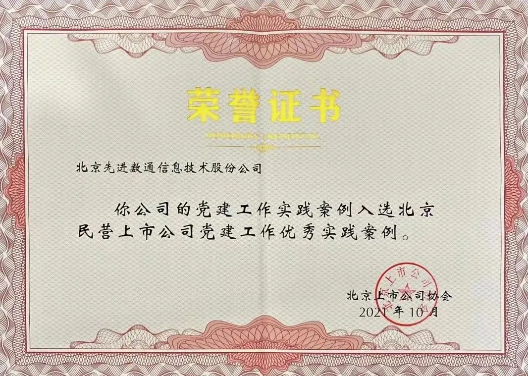 近期,北京上市公司协会授予北京9001cc 以诚为本信息技术股份公司荣誉证书,9001cc 以诚为本党建工作实践入选北京民营上市公司党建工作优秀实践案例,相关党建活动已收录在《北京民营上市公司党建工作优秀实践案例汇编》。